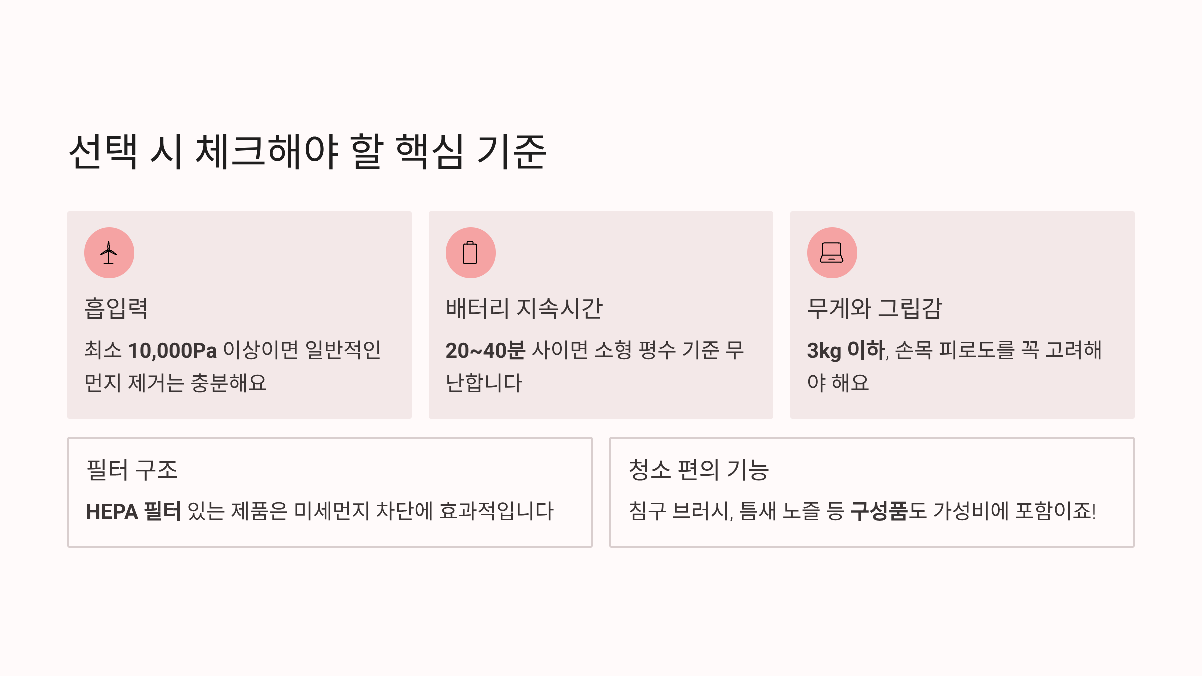 Pa(파스칼) 또는 AirWatt 수치를 확인하세요. 10,000Pa 이상이면 일반 가정용으로 충분합니다. - HEPA 필터 유무