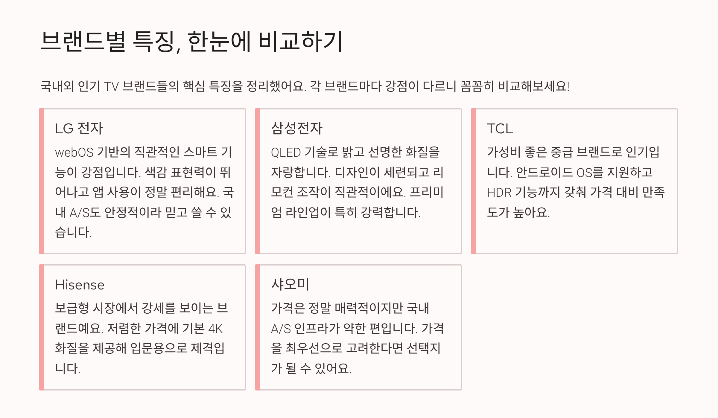 - **LG**: 색감 좋고, webOS로 앱 사용 편리함. 스마트 TV 기능 충실.