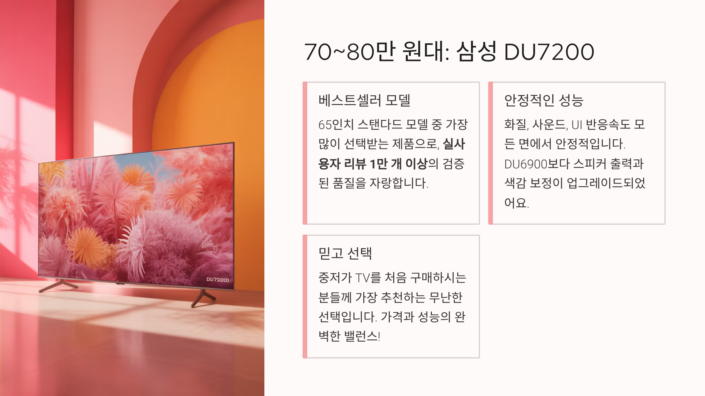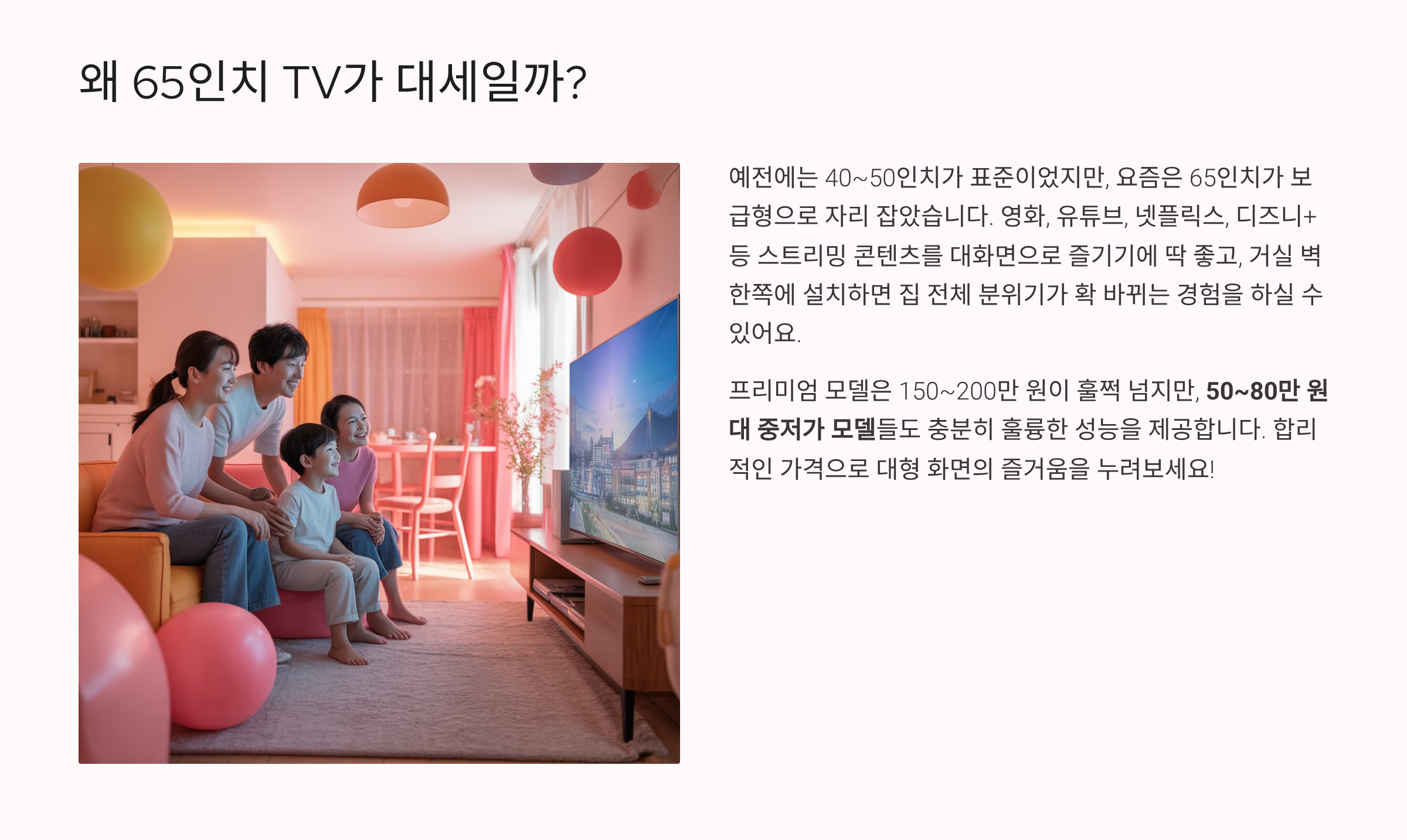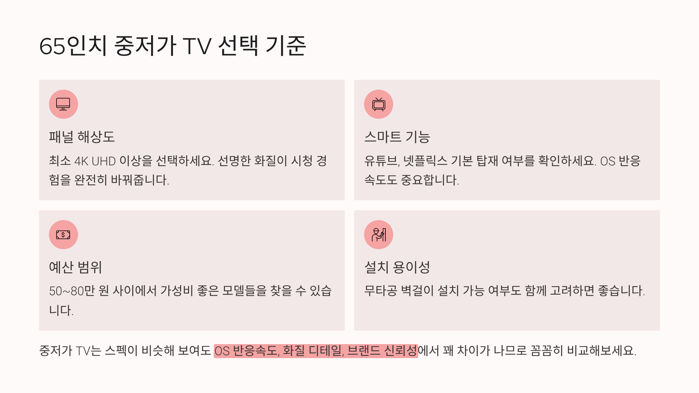 💬 어떤 65인치 TV를 고려 중이신가요? 예산과 사용 환경을 알려주시면 맞춤 추천 도와드릴게요