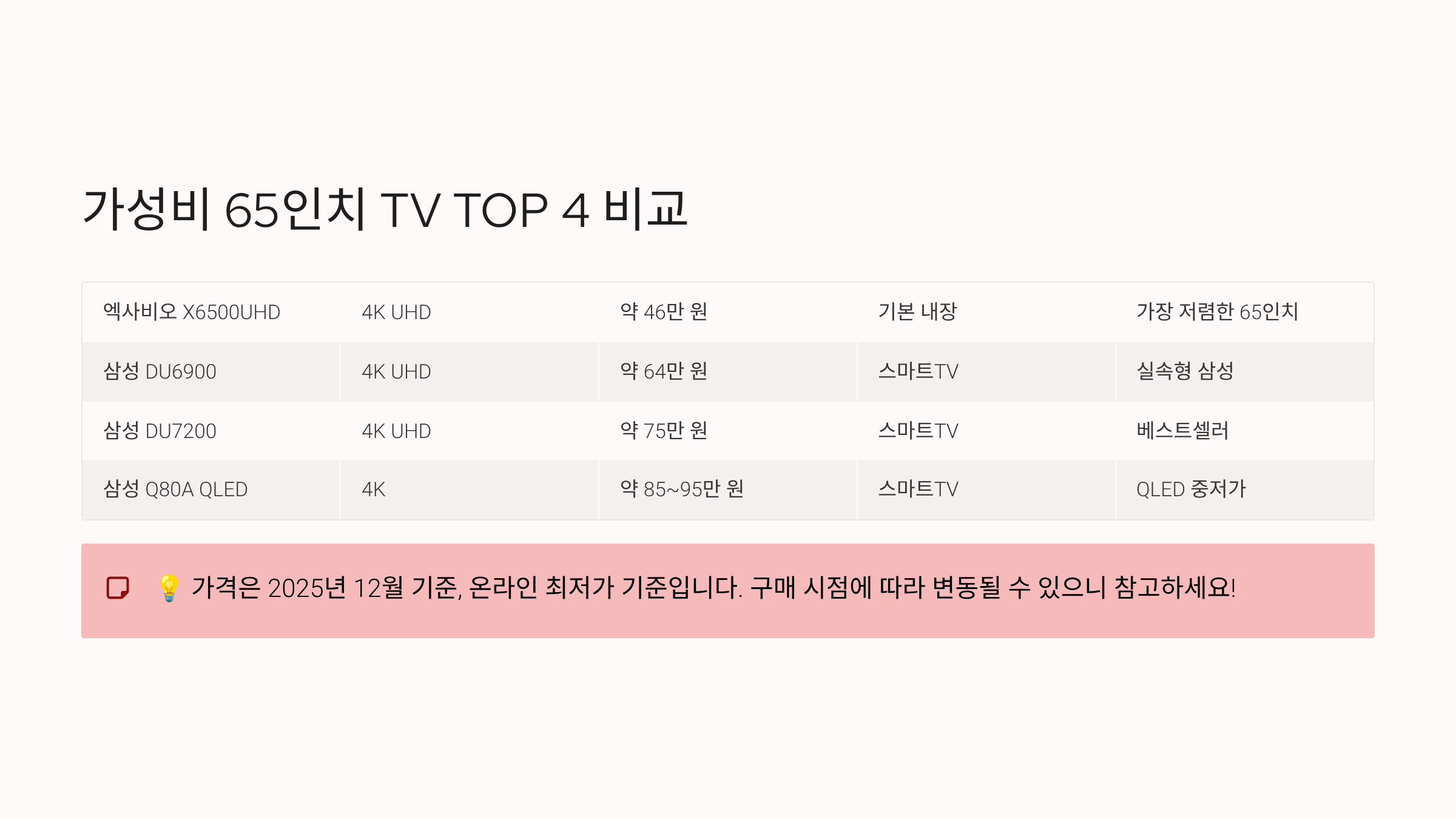 가격만 보지 마시고, 화질 + 스마트 기능 + 브랜드 신뢰를 종합적으로 고려해서 선택하세요. 여러분의 거실에 딱 맞는 65인치 TV를 찾으시길 바랍니다! 😊