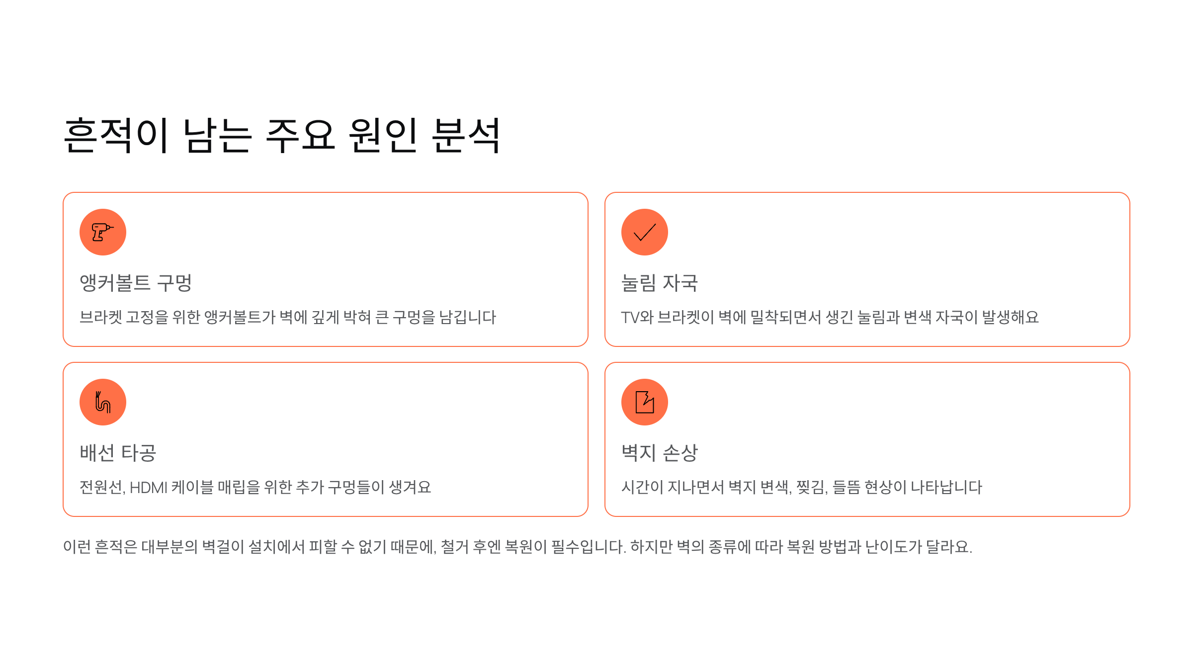 이런 흔적은 대부분의 벽걸이 설치에서 피할 수 없기 때문에, 철거 후엔 복원이 필수입니다.