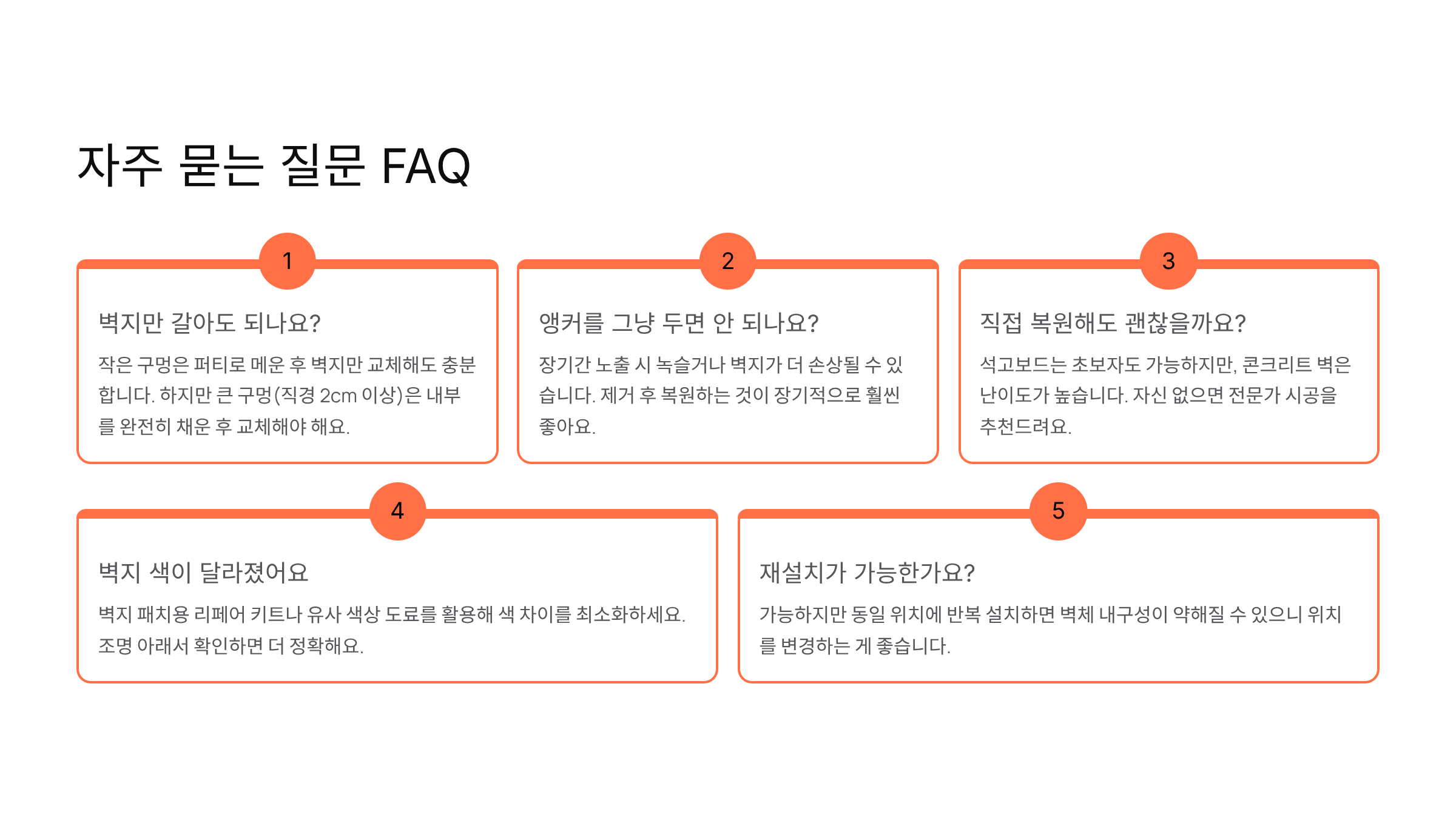 - **콘크리트 벽**: 구멍이 깊고 단단해 퍼티만으로는 부족할 수 있음. 앵커 제거 후 몰탈 또는 콘크리트 필러로 마감 필요