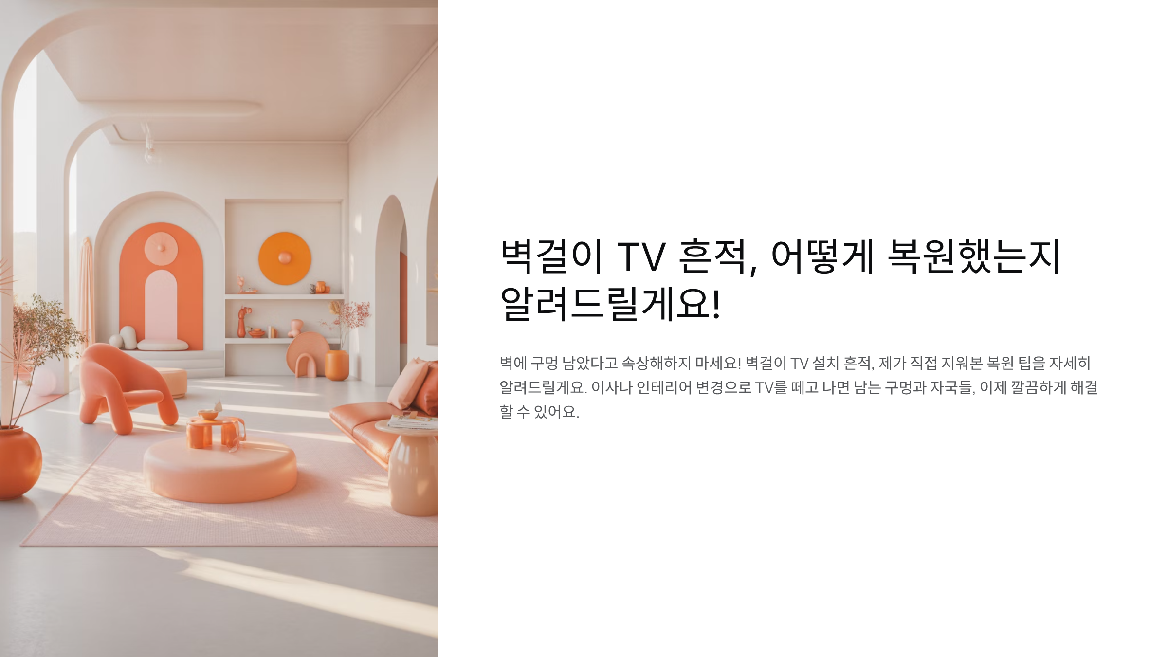 **태그:** 벽걸이TV, 철거흔적, 벽복원, 구멍복구, 셀프인테리어, 석고보드수리, 콘크리트벽수리, 벽지복원, TV설치팁, 인테리어팁