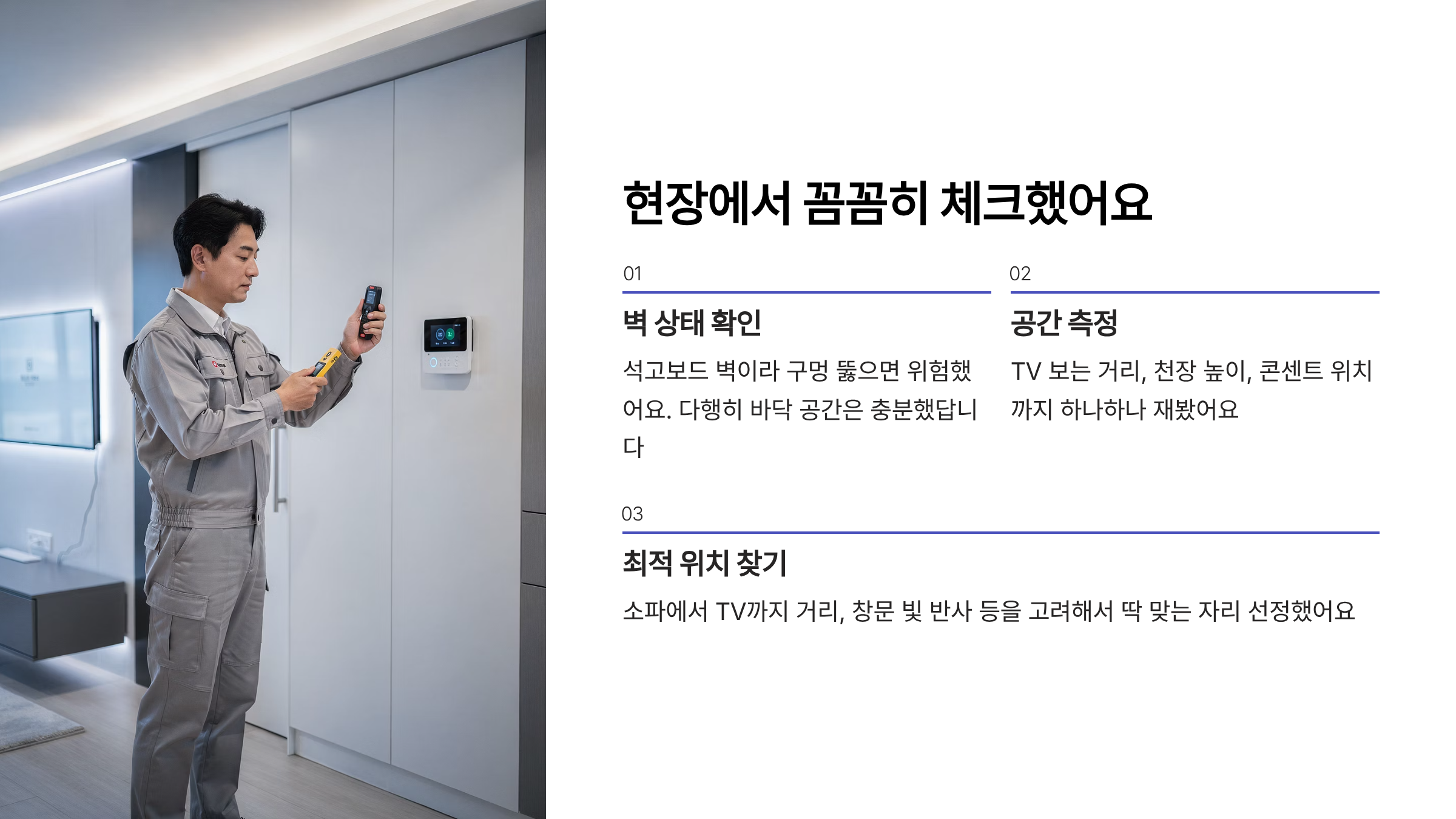 또한 콘센트 위치, TV 크기, 시청 거리 등을 고려해 **최적의 설치 위치**를 선정해 드렸습니다.